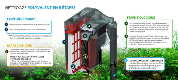 Les filtres à moteur clipables Fluval de série C sont les premiers et les seuls au monde à offrir une filtration complète en 5 étapes, soit deux de filtration mécanique, une de filtration chimique et deux de filtration biologique, pour obtenir une eau exceptionnellement claire.