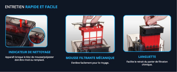 - Filtration mécanique en deux étapes emprisonnant les débris fins comme volumineux (les blocs de mousse se retirent facilement aux fins de nettoyage rapide);