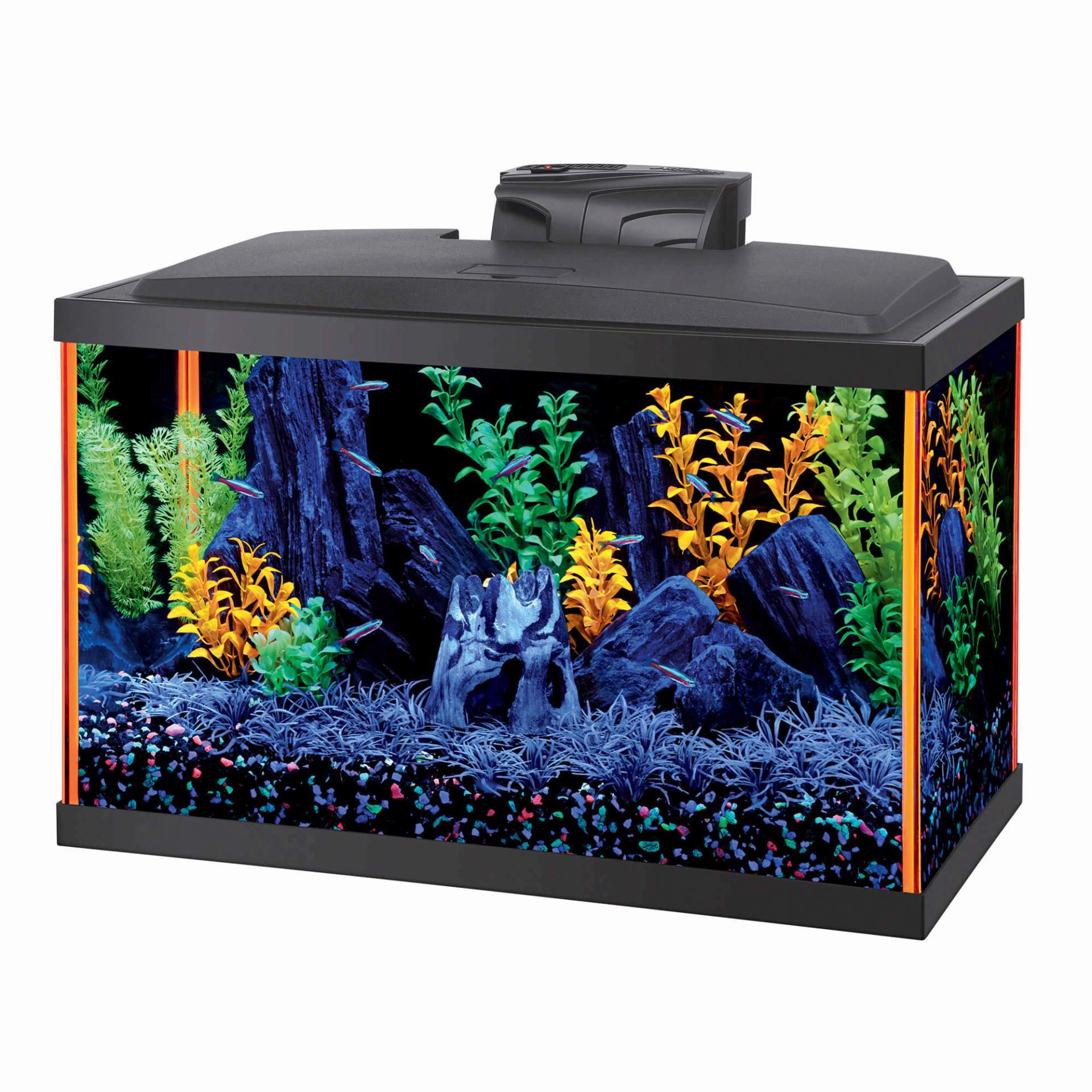 Le couvercle à profil bas avec des lumières LED de couleur bleue met en valeur les couleurs vives à l'intérieur de l'aquarium