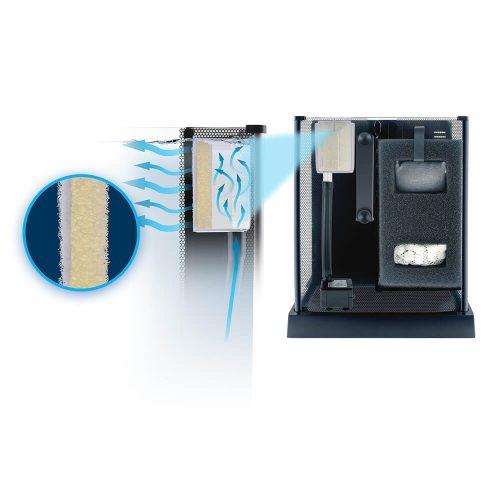 - Entrée d’eau diffuse avec multiples fentes sur une grande surface pour aider à ralentir le débit d’entrée d’eau et à protéger les nageoires délicates des bettas
